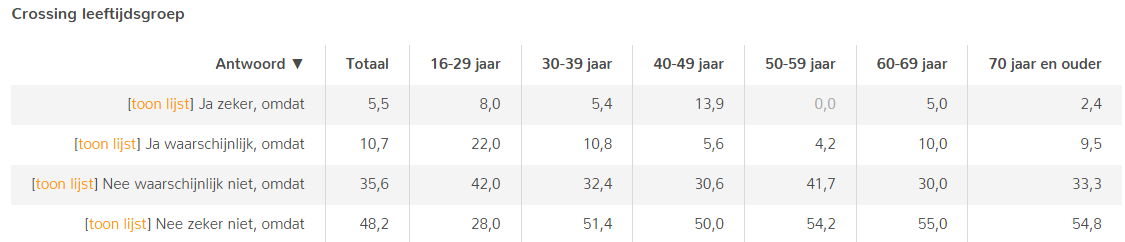 De steun voor het advies verschilt per leeftijdsgroep. Vooral mensen van 60-69 jaar (58,3%) en 70 jaar en ouder (49,1%) zijn het vaak helemaal eens met het voorstel. Jongeren tussen de 16 en 29 jaar zijn minder uitgesproken: 40% is het volledig eens, en 32,9% 'mee eens'. De leeftijdsgroep 40-60 jaar is het vaker (helemaal) niet eens met het advies. Ongeveer 16% is tegen het plan.